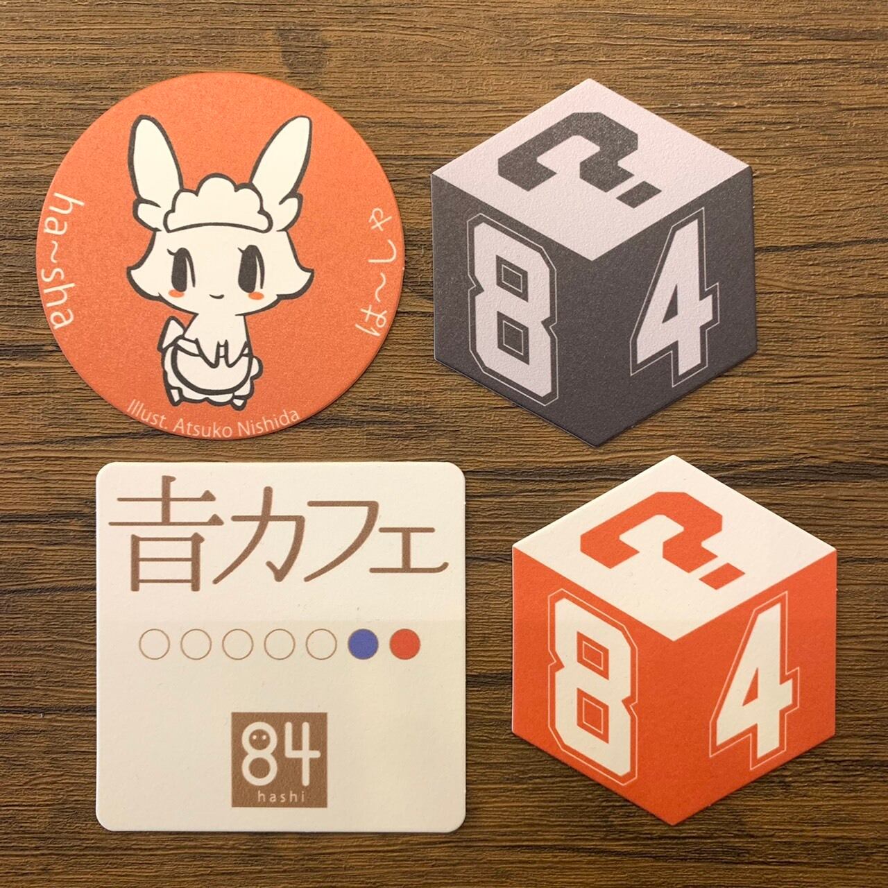 丸型、角丸型、六角型の3型4種類のセット。丸型は84のマスコットキャラクター「は〜しゃ」を配したオレンジのコースター。
